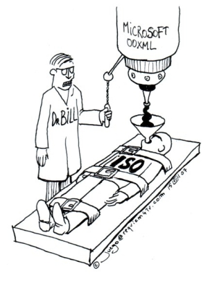 Diğer yandan Microsoft kendi XML format belirtimleri üzerinde çalışıyordu, ta 2000’den beri. Hatta Office 2003 o zamanki XML formatındaki dosyaları destekler durumdaydı. Office 2007 ise öntanımlı olarak yeni bir XML temelli format kullanacaktı. Microsoft’un ofis dokümanı formatları hemen her zaman kapalı, gizlilik anlaşmaları ve fikri mülkiyet hukuku ile koruma altında olmuştu. Bir önceki sürümlerde kullandığı XML temelli formatları bir sonraki sürümde desteklememek ise en sık rastlanan uygulama idi. Bu arada bilişim dışı arenada da ilginç gelişmeler yaşanıyordu: Kullanıcılar ofis dokümanlarının açık standartlara uygun formatlarda saklanmasını istemeye başlamışlardı. Hatta AB 2004 yılında OASIS’e desteğini belirtirken Microsoft’a da format belirtimini açmasını ve standartlaştırmasını öneriyordu. Microsoft bu öneriyi ciddiye aldı. Ama ancak çeşitli Avrupa ülkeleri ve kimi ABD eyaletleri o zaman mevcut tek açık format belirtimi olan ODF’i desteklemeye başladıklarında. Hem de ODF’in ISO’ya sunulmasının hemen ardından… ECMA (European Computer Manufacturers Association) altında oluşturulan bir teknik komite ile ve bir yıllık bir çalışmanın ardından, tam da ISO’nun ODF’i yayınlamasının ardından ECMA, Office Open XML (OOXML) format belirtimini yayınladı.İlk başta işler OOXML’in, ve dolayısı ile Microsoft’un, aleyhine gelişti: 6000 sayfayı aşan, buna karşın sınırlı itiraz süresinde 20 ülkeden 3000’in üzerinde teknik eleştiri (her ikisi de “ISO rekoru”) alan, mevcut standartları kullanmak yerine sahipli ve kapalı kimi formatlara gönderme yapan, kapalı bir süreç ile geliştirilen, içinde pek çok patent ve korunmş fikri mülkiyet barındıran OOXML’ini hem de hızlı hattan (fast track) ISO kabulü alması pek olası görünmüyordu. Öyle de oldu, Eylül 2007 başında yapılan oylamada OOXML her iki kriterde de (ana üyelerin 2/3 kabulü, tüm üyelerin 1/4’ten az reddi) başarısız oldu. Ardından komedi başladı… ISO bu aşamada hızlı hat sürecini dururup metni ECMA’ya iade etmesi gerekirken süreci işletmeye devam etti. Şubat sonunda Cenevre’de düzenlenen Oy Çözümleme Toplantısı’nda 2000’e yakın teknik eleştiriye ECMA’nın verdiği yanıtlar tek bir oylama ile (mevcut ülkelerin ezici çoğunluğu böyle bir oylamaya katılmamayı tercih etti) “kabul” edildi. 29 Mart günü sonuçlanacak olan nihai oylama için Microsoft tüm dünyada her türlü lobi ve baskı çalışmasını elini kolunu sallayarak yürüttü… Daha birkaç yıl önce Tek Standart, Tek Test: Heryerde Muteber sloganları atan ISO da bu gidişe göz yumdu, hatta yataklık etti. Ayrıntıları OOXML’e karşı küresel dayanışma sitesi NoOOXML‘den ve camia sitemiz Özgülükİçin.com‘dan izleyebilirsiniz. Sonuç: Oy veren 32 ana üyeden 24’ü OOXML’i kabul etti ve oy veren 71 üye ülkenin yalnızca 10’u OOXML’i reddeti. OOXML her iki kriteri de açık ara sağlayarak bir ISO standardı haline geldi.