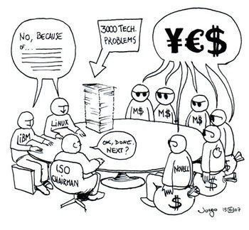 - ISO’nun yol vermesi, “temiz” ülkelerin de rica, minnet, rüşvet ve tehdide boyun eğmesi ardından açık ve özgür standartların en yılmaz temsilcisi olarak Avrupa Birliği kaldı. Microsoft’un tekelci taktiklerine ceza üzerine ceza kesen, en başında OOXML’in ISO standardı olmasını şart koşan, sonrasında OOXML oylamasında dönen dolapları cesurca soruşturmaya başlayan yine eski dünya oldu. Tekelciliğe, bağımlılığa ve güdülmeye karşı çıkanlar, AB ile aynı safta durun!